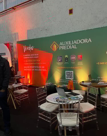 Montagem de estruturas estratégicas com backdrop personalizado para exposição de marcas e ativações visuais.